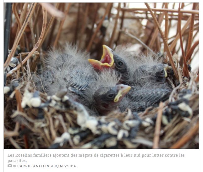 Plusieurs espèces d’oiseaux ajoutent des plantes vertes lors de la confection de leur nid afin d’éloigner les parasites de leur progéniture. Les Roselins familiers (Haemorhous mexicanus) qui vivent en zones urbaines ont trouvé une autre solution, ils utilisent des mégots notamment la cellulose présente à l’intérieur.