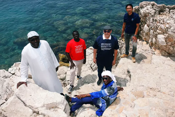Photo : De g.à d. : Bekaye sy Samba, Mustapha Manneh, Mansour Boidaha, Diaba Diop et Prya Thedyam, à Nice, le 10 juin 2025. Ils viennent respectivement de Mauritanie, Gambie, Mauritanie, Sénégal et Thaïlande. – © Laurent Carré / Reporterre