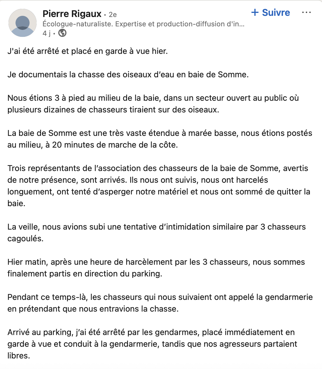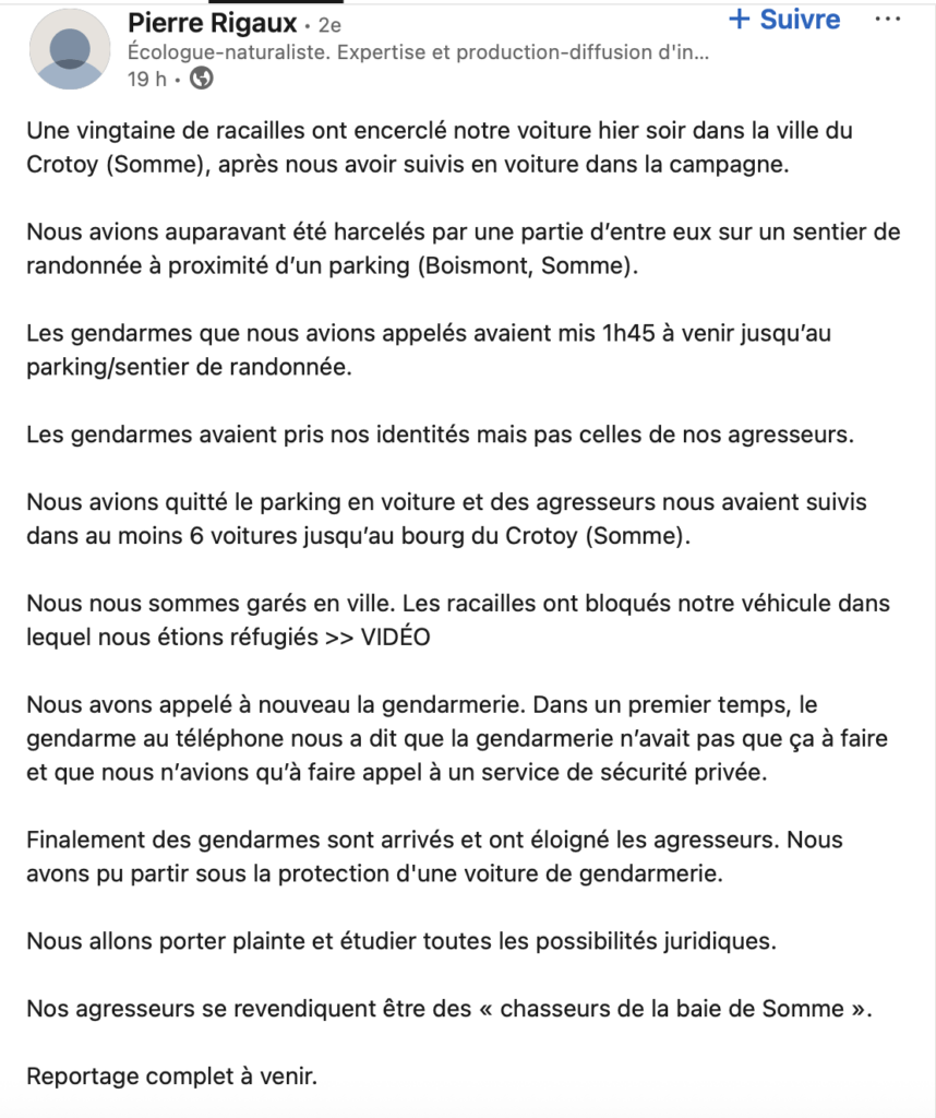 Après les dégradations faites au domicile de Claire Nouvian, fondatrice de Bloom, après les arrestations et amendes infligées aux opposants de l’69, voici les menaces et intimidations proférées en toute impunité contre Pierre Rigaux, naturaliste et militant engagé pour l’écologie, la cause animale et l’abolition de la chasse .