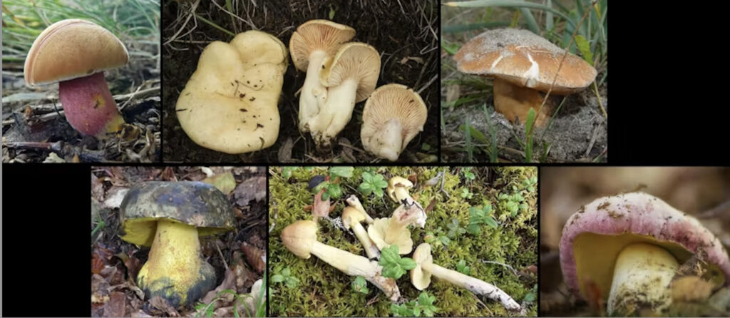 : Quelques-uns des champignons présents en France, considérés comme en danger par la liste rouge des espèces menacées. De gauche à droite : bolet rubis (Chalciporus rubinus), lactaire des saules réticulés (Lactarius salicis-reticulatae), bolet des sables (Gyroporus ammophilus), bolet de plomb (Imperator torosus), tricholome brûlant (Tricholoma aestuans), bolet rose pastel (Rubroboletus pulchrotinctus). Wikicommons, CC BY